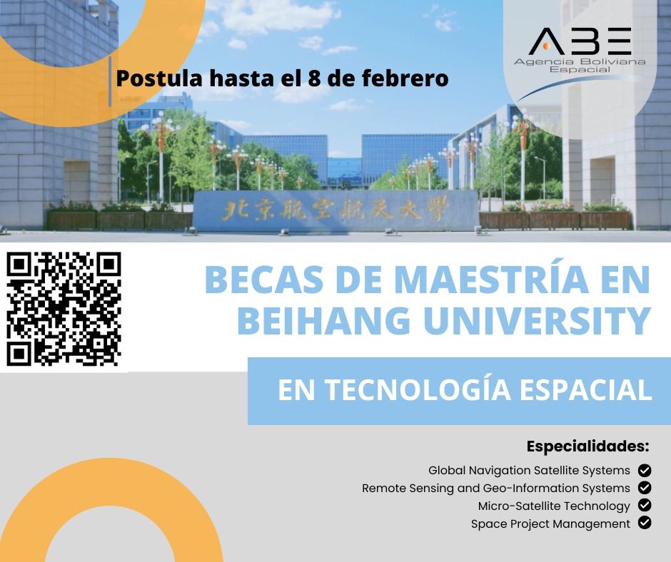 El China Scholarship Council (CSC) y el Regional Centre for Space Science and Technology Education in Asia and the Pacific (RCSSTEAP) en coordinación con la Agencia Boliviana Espacial (ABE), otorgan para el curso académico 2026, 3 Becas a profesionales bolivianas y bolivianos para cursar el programa de Master en Space Technology.  El plazo máximo para la presentación de postulaciones es el 8 de FEBRERO de 2026